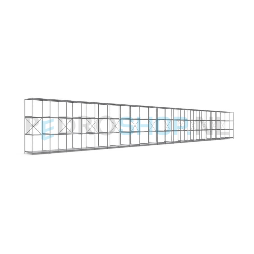 Metalen stellingkast: 300cm (h) x 100cm (d) x 2317.4cm (l)